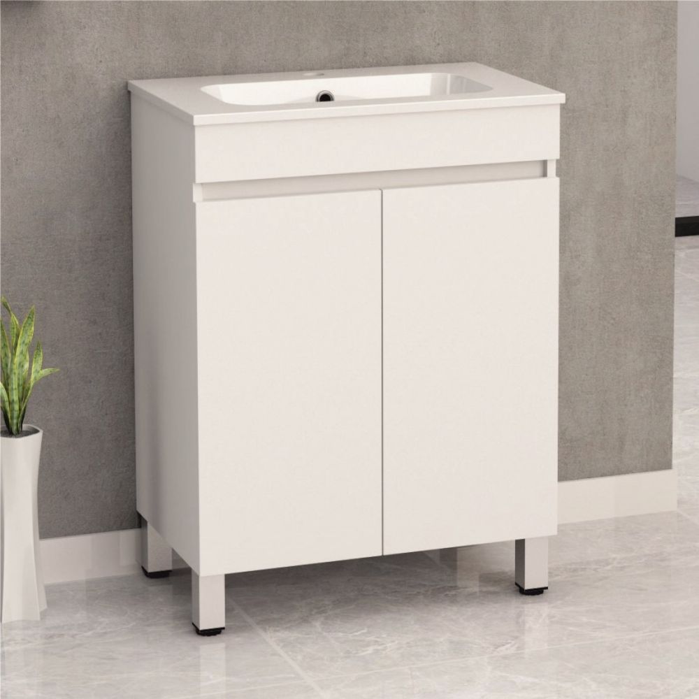 Стоящ шкаф за баня с 2 врати Материал: PVC Задна дъска: 5mm Останалата част: 15mm DTC панти с плавно затваряне Алуминиеви регулируеми крачета 10cm височина Без рафт Боядисани двете страници и предна част KD опаковка Умивалник от смола