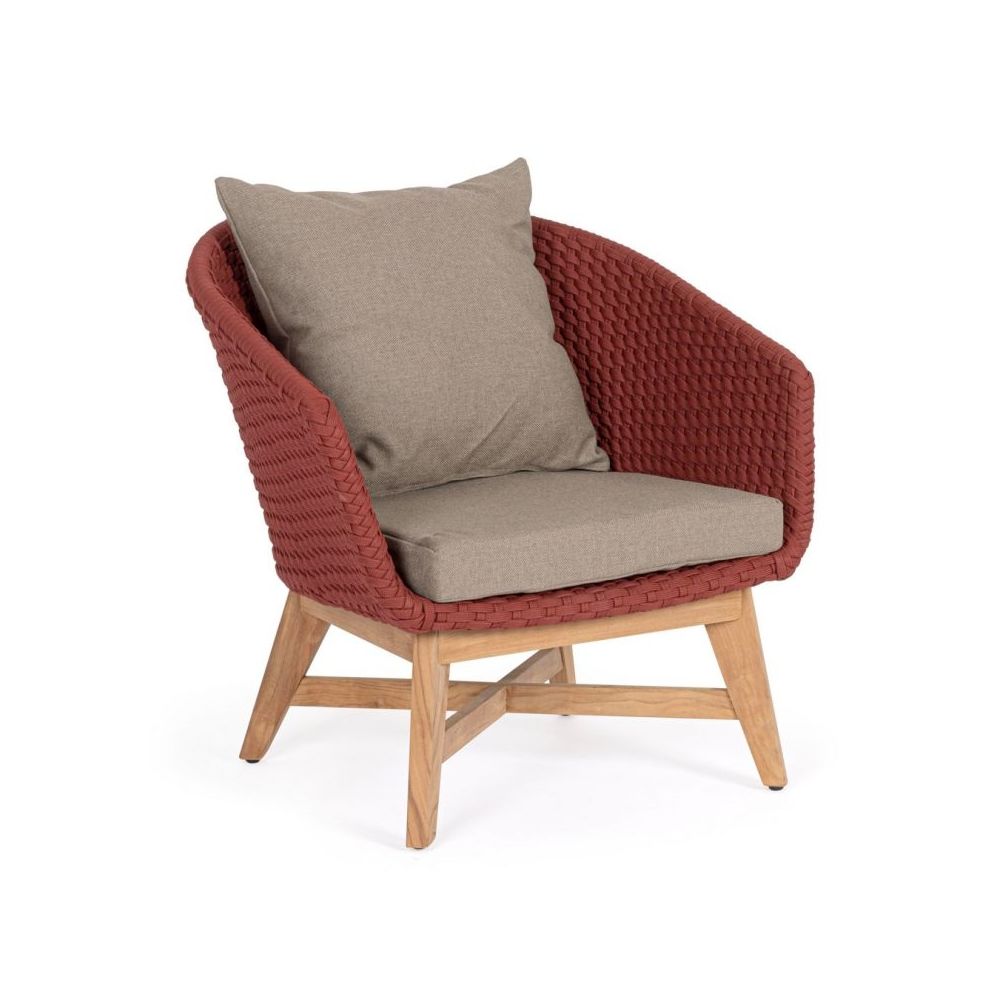 Седалка с алуминиева рамка с прахово покритие (полиестер). Плетка от олефиново въже (100% полипропилен). Възглавници за седалка и гръб с подвижна калъфка от водоотблъскващ плат sunproof olefin (100% полипропилен). Крака от тиково дърво – svlk (индонезийска легална дървесина). Поцинковани стоманени винтове. Краката се сглобяват. Внимание: преди сглобяване се уверете, че номерацията на седалките и краката съвпада.