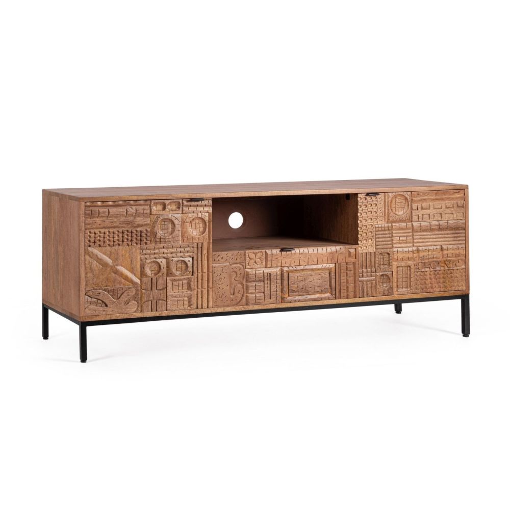SOLID MANGO WOOD FRAME, MDF BACKREST. NITROCELLULOSE-BASED PAINT. STEEL LEGS AND HANDLES. FRONT DRAWERS AND DOORS INLAID AND WORKED BY HAND. DOOR COMPARTMENT WITH SHELF. LEGS TO BE ASSEMBLED.