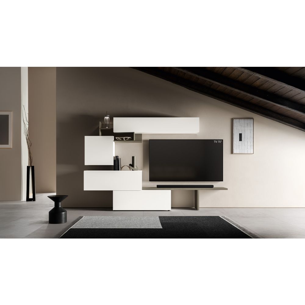A living room that stands out for its variety of modules and units, like the freestanding composition consisting of the Taos self-supporting bench and the Stilo shelves.