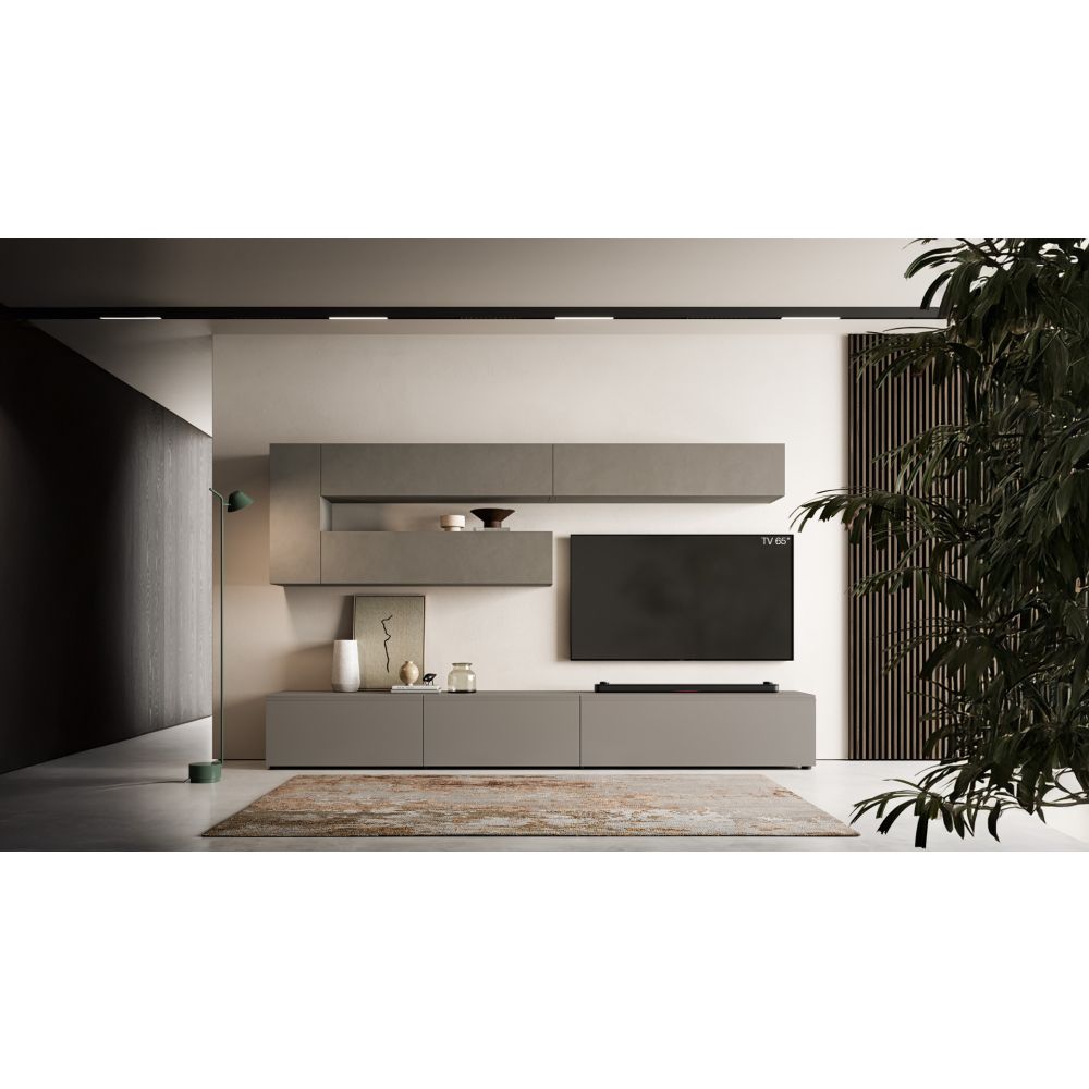 Simple, compact, geometric design. Units with tilt and flap doors define an organised and functional wall. A solution that emphasises the cleanliness of the lines, ideal for a contemporary and practical living room.