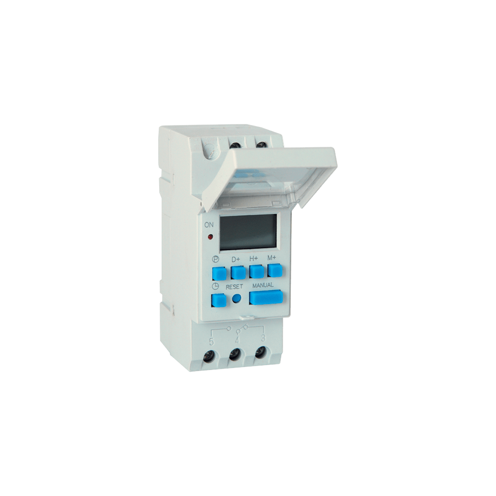The timer is manufactured under the CMOS technology with a quartz mini controller which makes it reliable for operation. The timer is adjusted for DIN-rail mounting. It can memorize up to eight ON/OFF programs ON/OFF cycles. Each program setting is done through the push buttons. Programming starts with selection of the days of the week you can choose among a whole week cycle, workdays cycle, weekend cycle, or a specific day of the week; then the cycle start time and end time are set. If you have selected workdays cycle, then the program will start and stop at the set times each workday of the week. This is one ON/OFF program. Where necessary, other programs can be memorized up to the limit of eight possible programs. If you continue setting new programs the first memorized program will be deleted. The minimal interval for cycle programming is 1 minute.