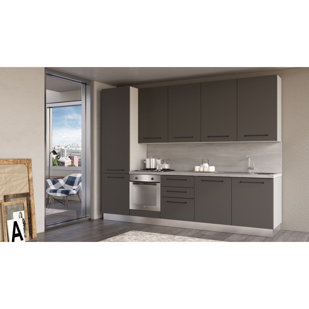 Оборудвана Права кухня LINE, 300 см, лице тъмно сиво, плот и гръб цимент