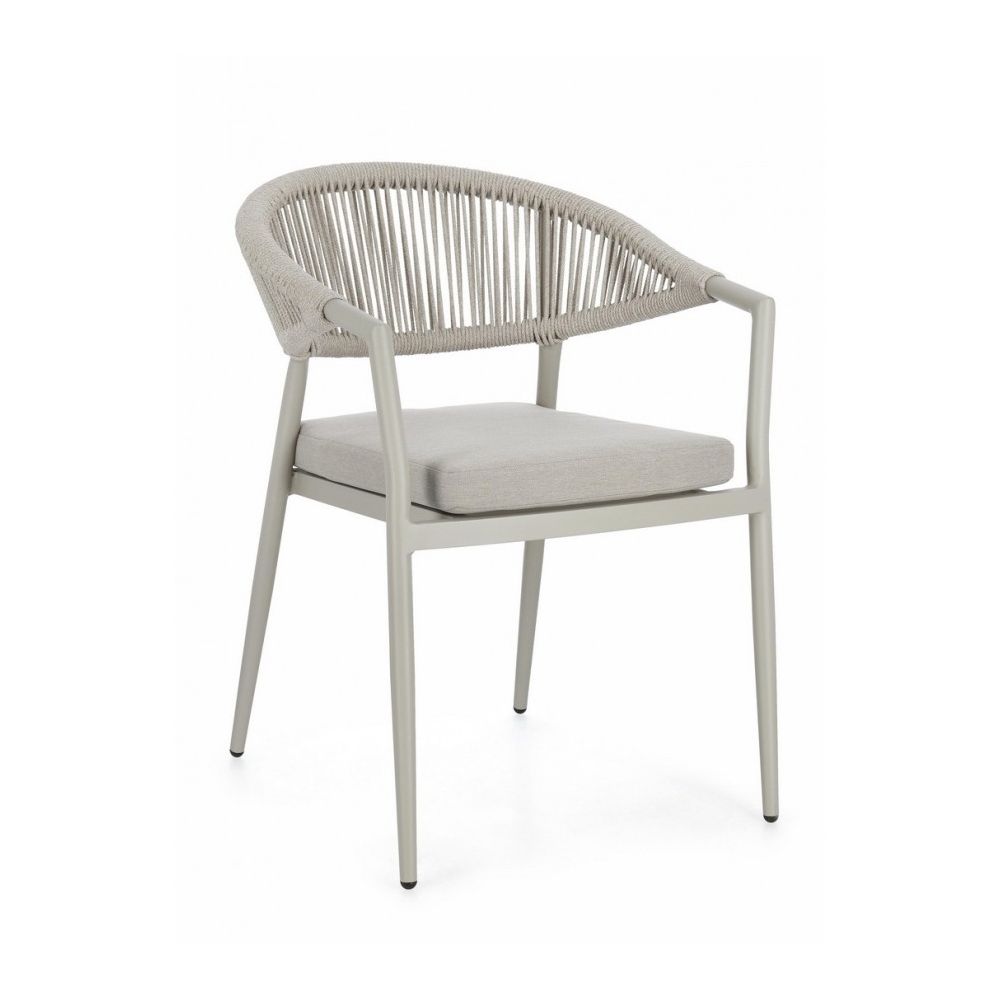 STRUCTURE IN POWDER-COATED ALUMINIUM (POLYESTER). WEAVING FOR OUTDOOR USE IN POLYESTER ROPE. REMOVABLE CUSHIONS IN 100% WATER-REPELLENT POLYESTER. STACKABLE.