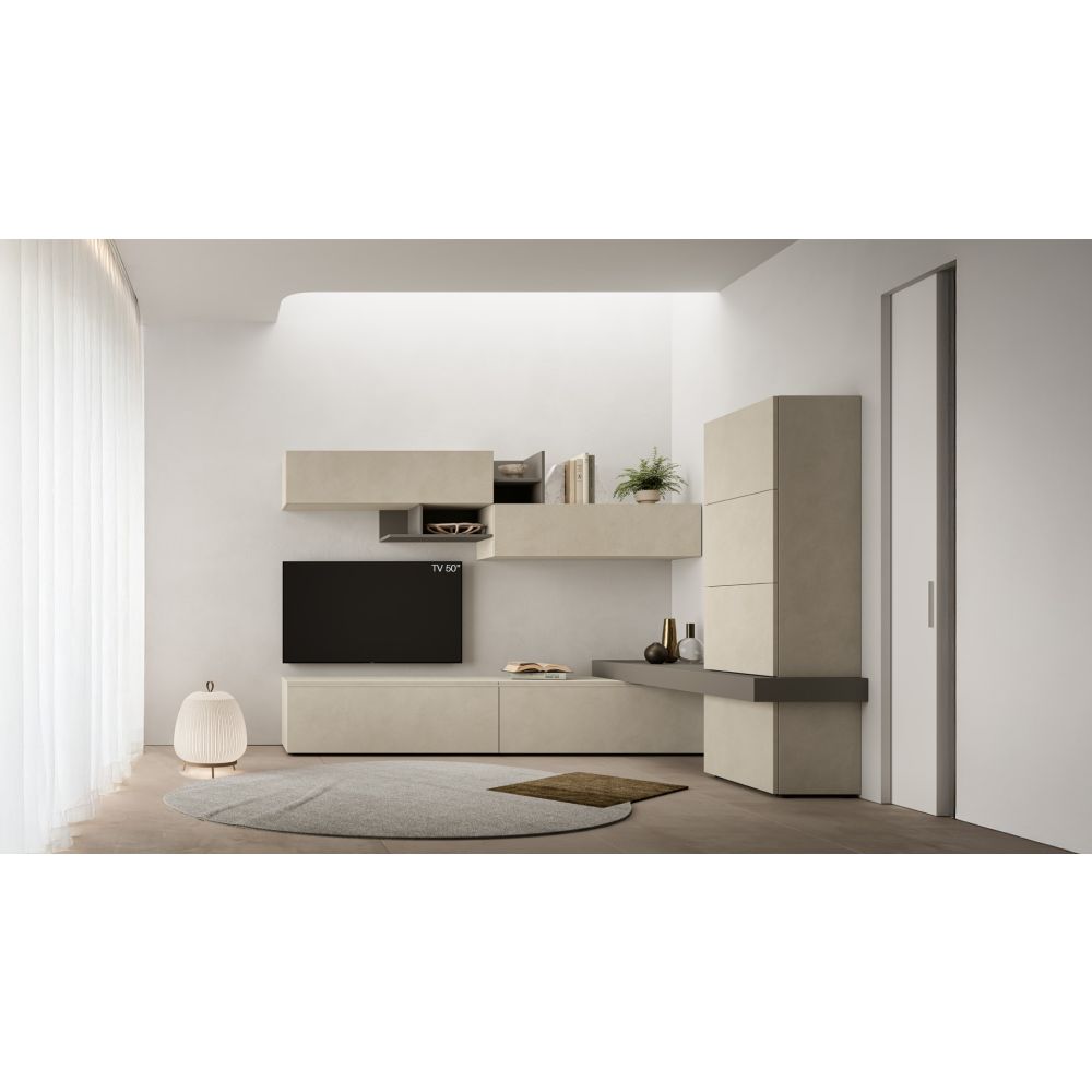 Ъглова композиция, допълнена с дебели, но минималистични долни шкафове, стенни шкафове и рафтове. Комбинация, която оптимизира пространството и предлага максимална стилистична гъвкавост и потенциал за персонализиране. *Възможност за избор на декор (свържете се с нас)