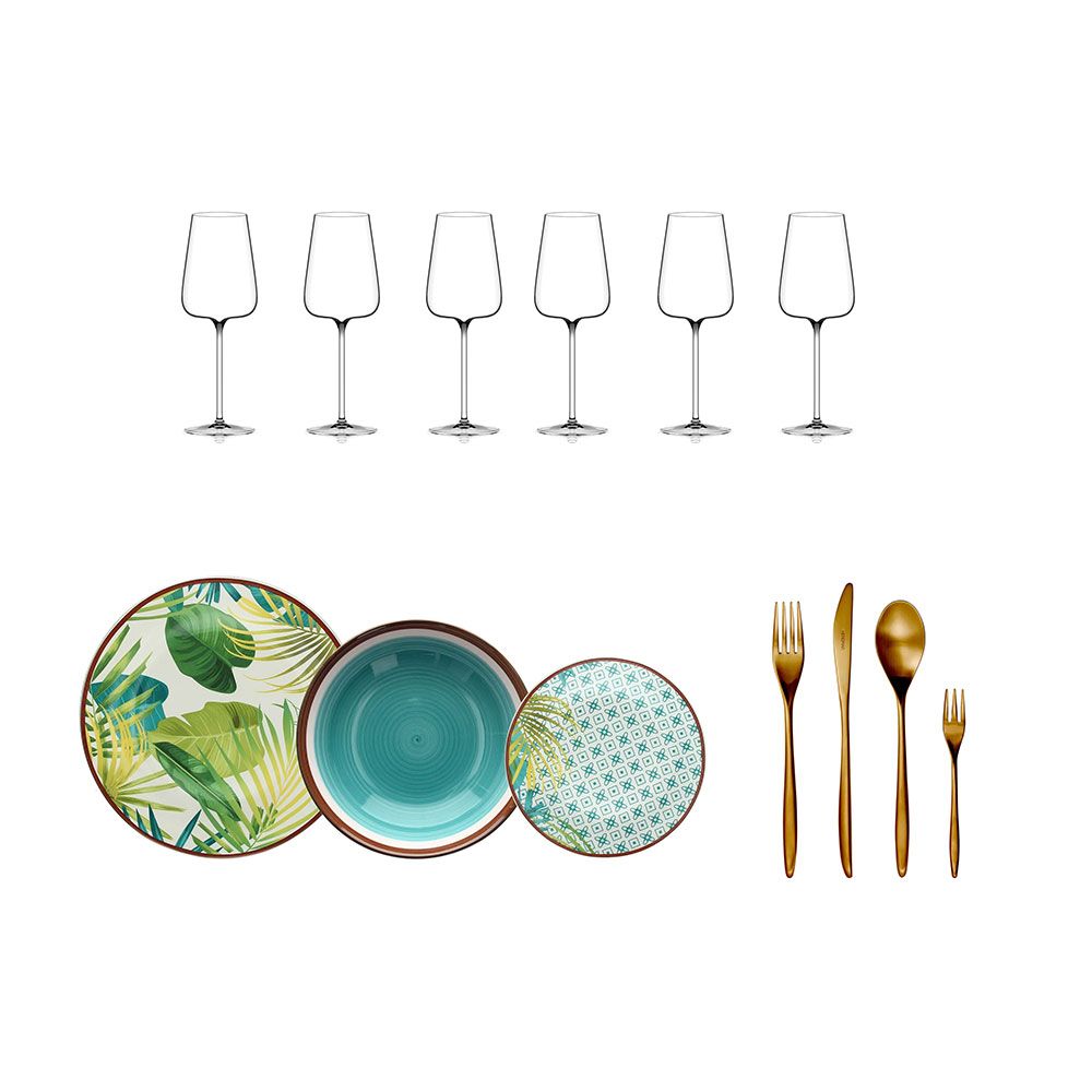 Комплект за сервиране с чаши за вино Etoile blanc, сервиз за хранене METROPOLIS JUNGLE и прибори Herdmar VINCI