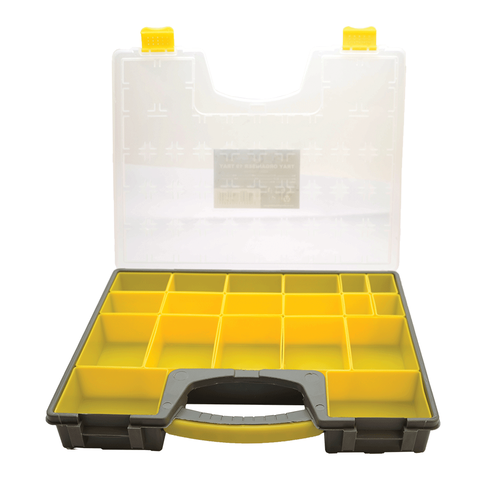 Практична пластмасова кутия-органайзер с 19 отделения и подвижни тавички – идеална за съхранение на инструменти, аксесоари и дребни части. Компактните размери 420x335x62 мм я правят удобна за пренасяне и подреждане.